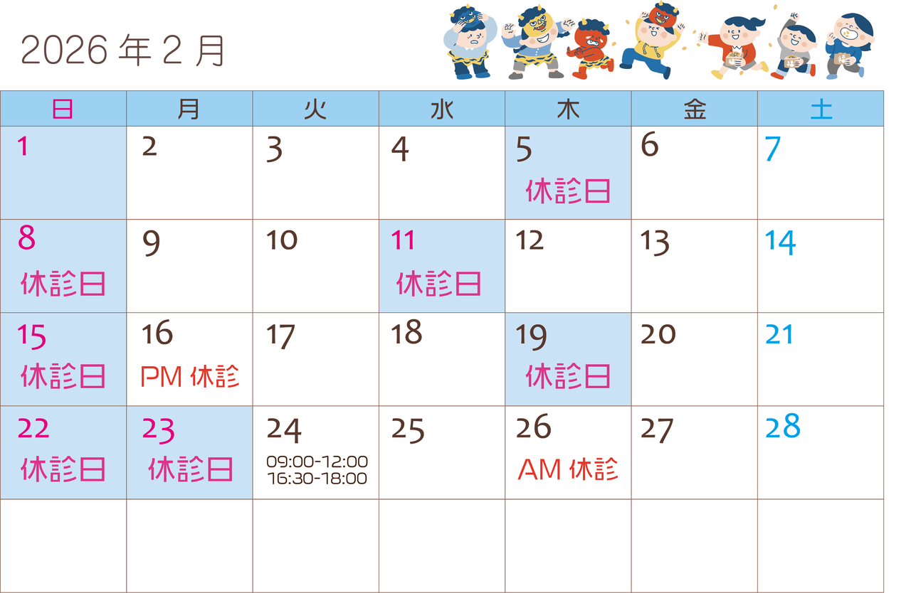 02月のカレンダーを更新しました。トップページ・ご予約ページにも掲載しておりますので、ご確認ください。