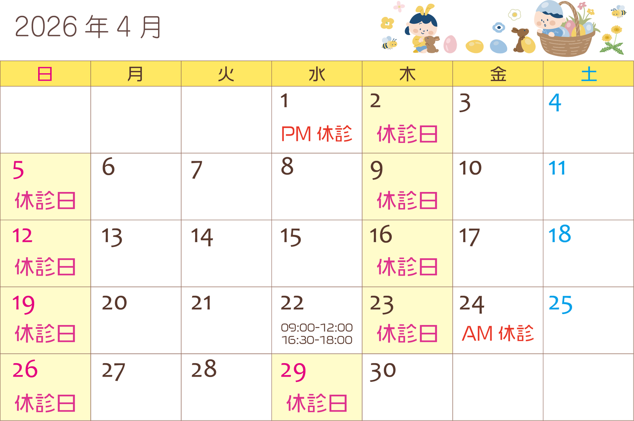 01日(水)22日(水)24(金)は診療時間に変更がございます。