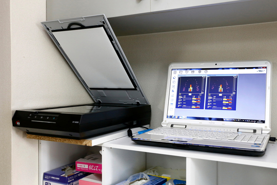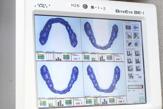 咬み合わせた時に上下の歯が接触する面積と、接触している箇所の数を、数値とグラフで可視化・数値化する装置です。咬み合わせ全体と左右バランスを検査します。