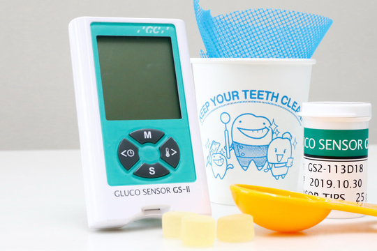 グルコース含有グミ「グルコラム」を20秒間咀嚼後、吐き出したろ液をセンサーチップに点着し、約6秒間で自動的にグルコース濃度を測定します。