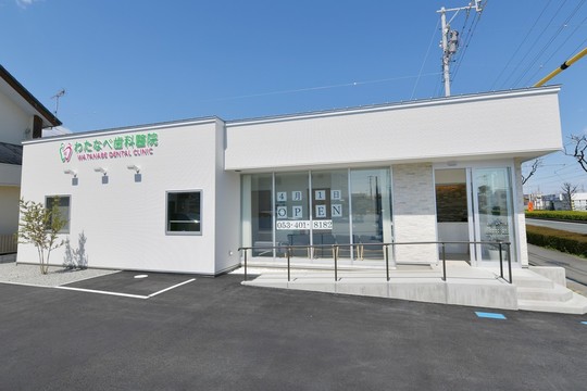 白を基調にした明るい外観です。駐車場は12台分ご用意していますので、遠方の方もお車でご来院いただけます。