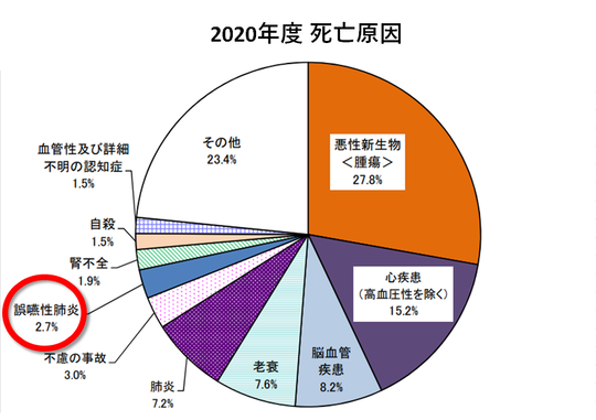 ご高齢の方の死亡原因の一つである「誤嚥性肺炎」は、食べ物を口に入れた際に、誤嚥(ごえん:誤って飲み込むこと)によって、唾液や胃液とともに細菌が肺に流れ込むことで起こる肺炎です。お口の中のケアが行き届かずに細菌が繁殖してしまうと、この誤嚥性肺炎にかかるリスクが高まるため注意が必要です。