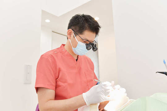 歯を大きく拡大して見ることができる歯科用ルーペ「拡大鏡」を使用して、歯を削ります。しっかり目で確認しながら処置できるため、削り過ぎを防ぐことができます。